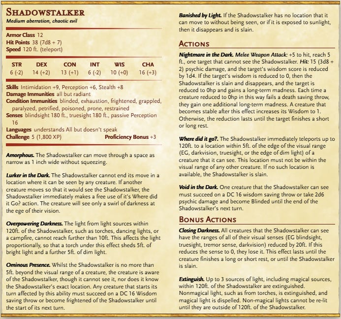 Shadowstalkers are a complex monster to run. They shouldn’t be added to random encounter tables, and they are never found on the surface - only within places where darkness is all-pervasive, and the dawn never rises. They are well-suited to dark dungeons, and can be the only threat on an entire floor quite easily. They are very much a thematic and plot-driving monster, rather than a square-off combat encounter. The intent behind them is that they are nigh-invulnerable, except from Radiant damage, making them terrifying to many adventurers. They also tend to focus solely on one character - it is worth innocuously determining fears from the party to see who is afraid of the dark, if anyone, and focus on them.