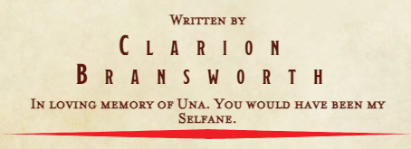 But the campaign fell through. The party never even met Clarion. I could have tucked the story away for another time, but I like the idea of my world as a living and adapting thing. So the bandits came, and Clarion sent some other adventurers to find his wife, and they died. Clarion waited, and he waited. He built a tavern and continued to wait. The town grew around him, and became known as Clarion’s Vigil. He learnt peoples stories and wrote books of folklore. And Una never came back. I opened his book, which I wrote and gave to my players in my current campaign, with this: