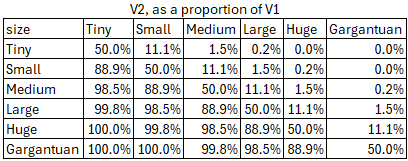 Immediately, I can see that this isn’t going to work very well with this premise. The Gargantuan one is so much larger than the large ones and smaller, and these are some horrible numbers to work with, meaning nobody in their right minds will use them.