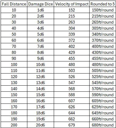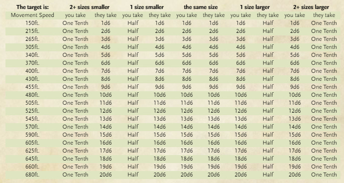The principle I am following is the 1st law of Thermodynamics5, which is that Energy can never be created or destroyed. Given that we’re not going nearly fast enough to transform matter into exciting new forms of energy, this will hold true. In game terms, it means that the energy represented by both the speed of the creature and the damage dice will remain consistent.