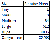 In D&D, the creatures all have a size category - from Tiny, all the way through Small, Medium, Large, and Huge, up to Gargantuan. The general premise of this is that each size class is twice as large in each dimension as the previous, meaning roughly 8 times more massive7 than the size below. This falls down a little at Tiny and Gargantuan, as they are open-ended - an ant is Tiny, but so is a cat, whilst a dragon is Gargantuan, and so is the dragon that hatches from the moon. This complication is not for me to overly worry about - if it becomes an issue, wing it; that’s the DM’s job.